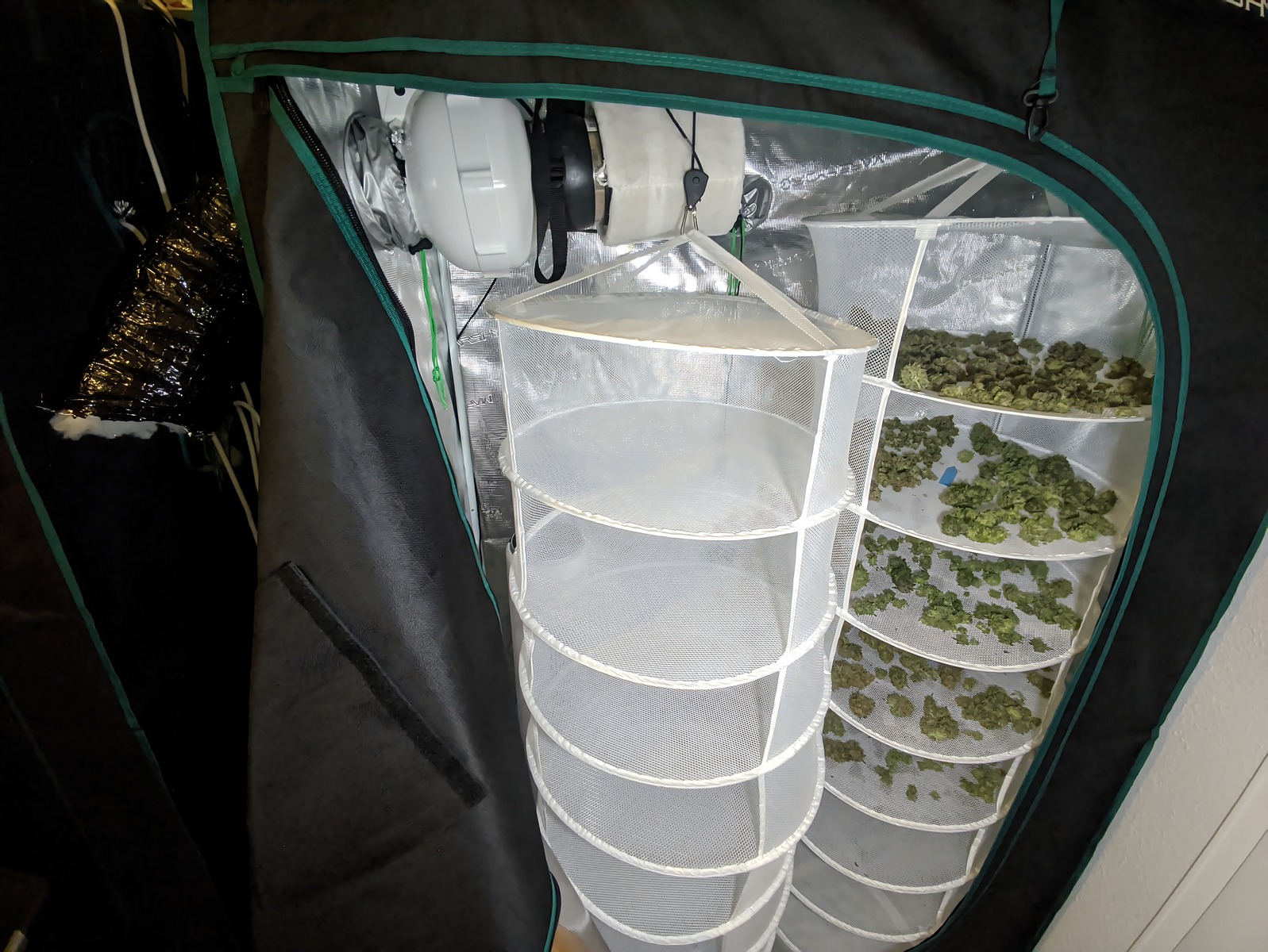 So sieht mein Trockensetup aus, die Abluft wird per Inkbird gesteuert damit die RLF auf 58% reduziert wird sobald es 62% erreicht. Ein Turmventilator steht da links hinten in der Ecke, gegen die Wand gerichtet damit die Luft nicht komplett steht wenn die Abluft aus ist. (Wichtig, niemals die Umluft auf die Buds richten)