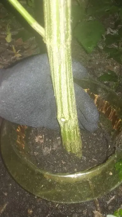 Das ist der riesige Seitentrieb einer 2,8m Pflanze, ohne solche Triebe gibt das bei so großen Pflanzen schnell bis zu 20-30% weniger Ertrag, mit Pech noch mehr.