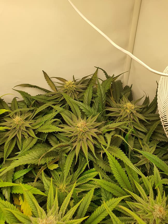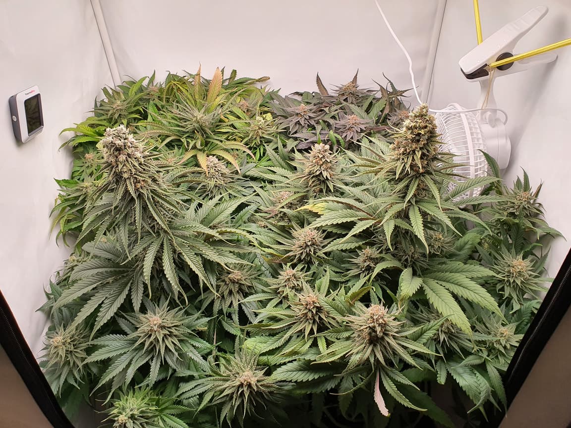 Die Luftfeuchtigkeit wurde gegen Ende ein richtiges Problem, weshalb ich mir einen Luftentfeuchter zulegen musste. Der kam aber erst beim Trocknen zum Einsatz, vor der Ernte sind mir noch die beiden Mainbuds zu einem guten Teil weggeschimmelt. Ungeil.