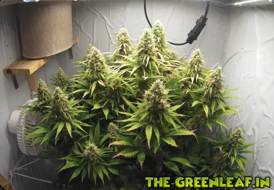 oder in Kartons im Blütezelt trocknen; oben in den Kartons ein Fadenkreuz ziehen und darin aufhängen, die Kartons dann einfach zwischen den Töpfen auf dem Boden abstellen.