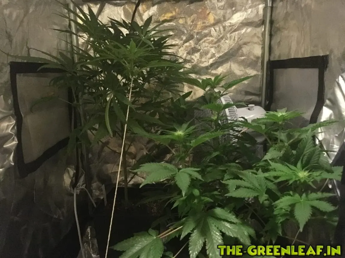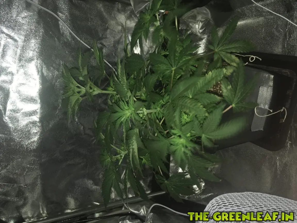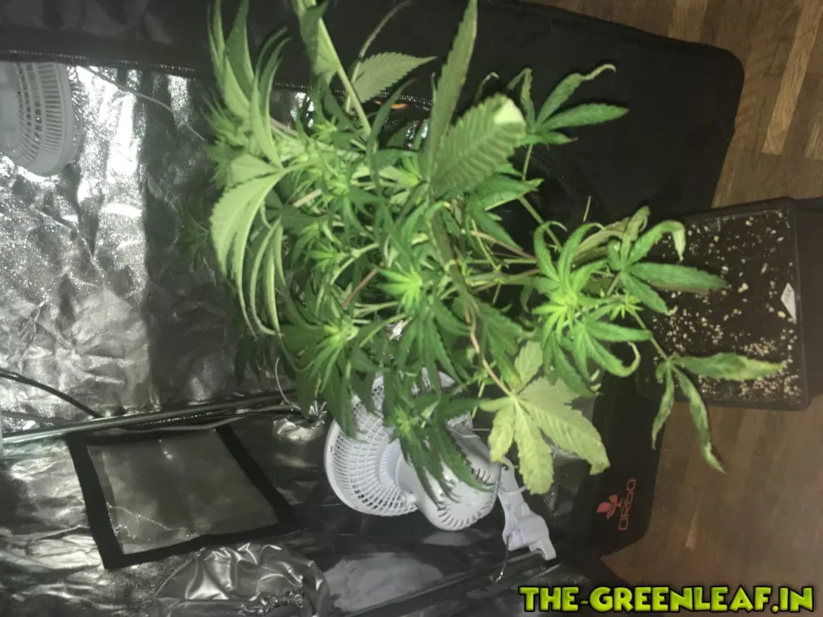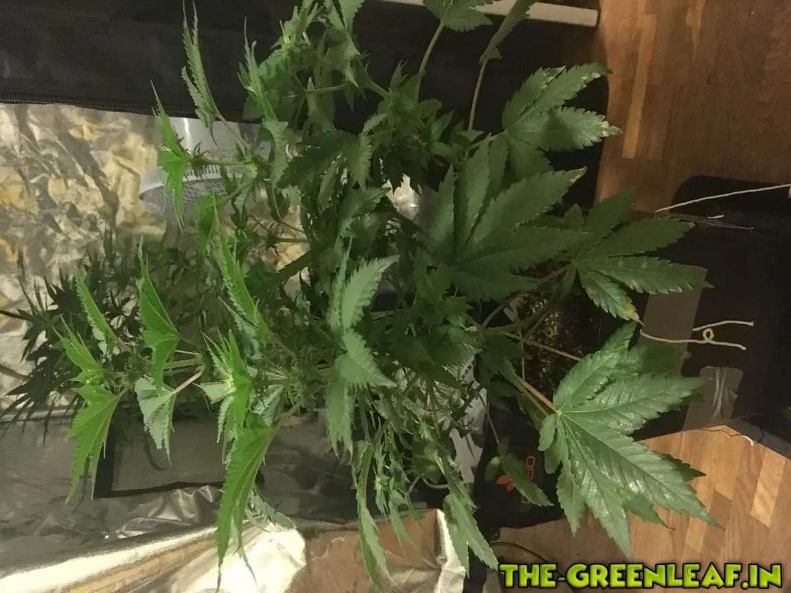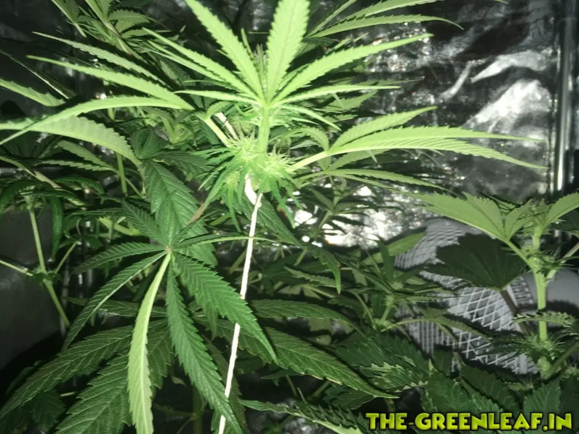 Die Early Skunk wächst wie verrückt, sieht mir auch sehr nach Sativalastig aus (siehe Blätterwerk). Hab sie nun ein zweites mal runter gebunden, um die Lampe wieder näher an die GSC hängen zu können.
