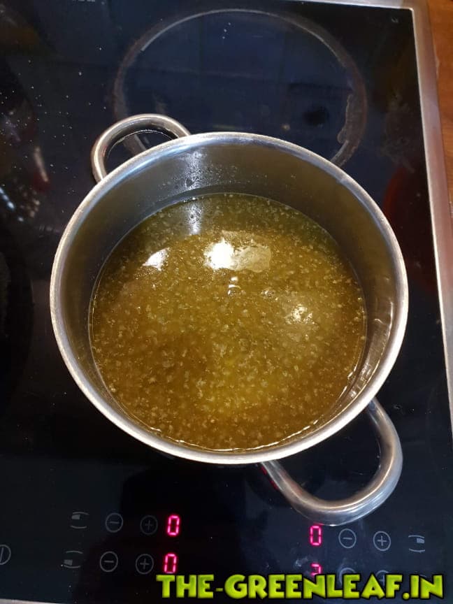 Die Butter würde mit 300ml Wasser zum schmelzen gebracht. Darauf hin kam das grün hinzu, und würde 3 Std. Bei schwacher Hitze gekocht. Also es war nur am Simmern und die Temperaturen lagen bei Max 120°.
