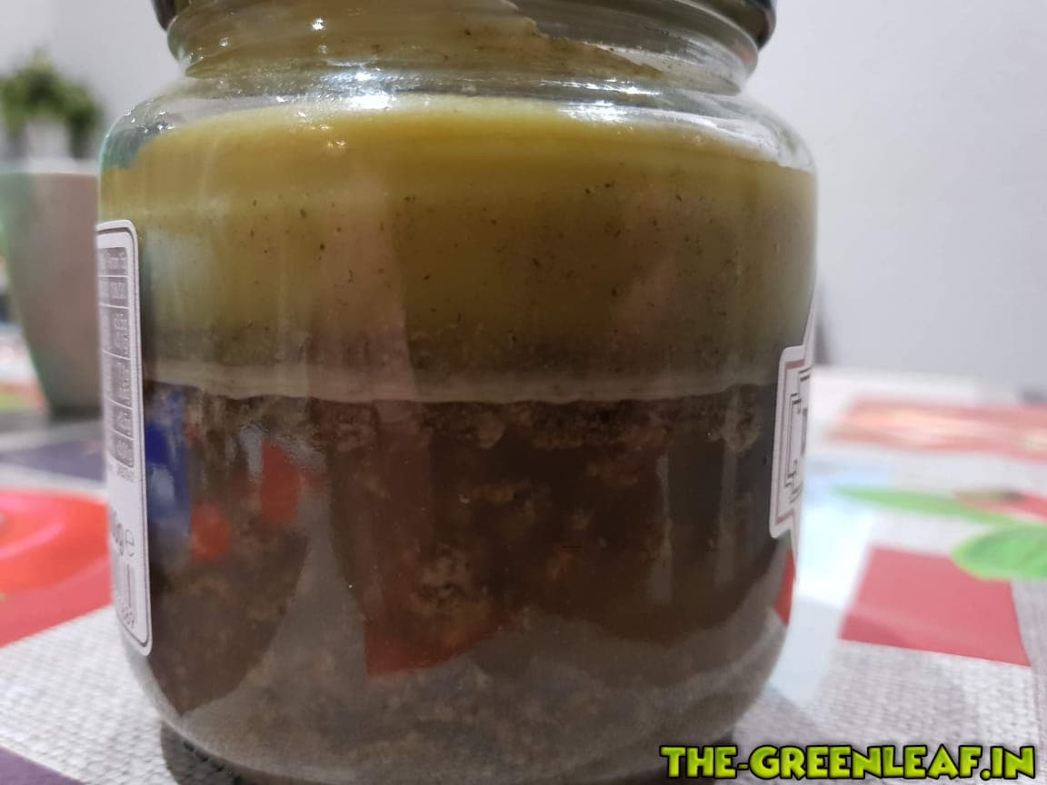 Danach wurde dann alles in Marmeladen Gläser geschütet und zum abkühlen in den Kühlschrank gestellt. Nachdem die Butter ausgehärtet war, habe ich das Wasser mit einem teil vom grün abgegossen.