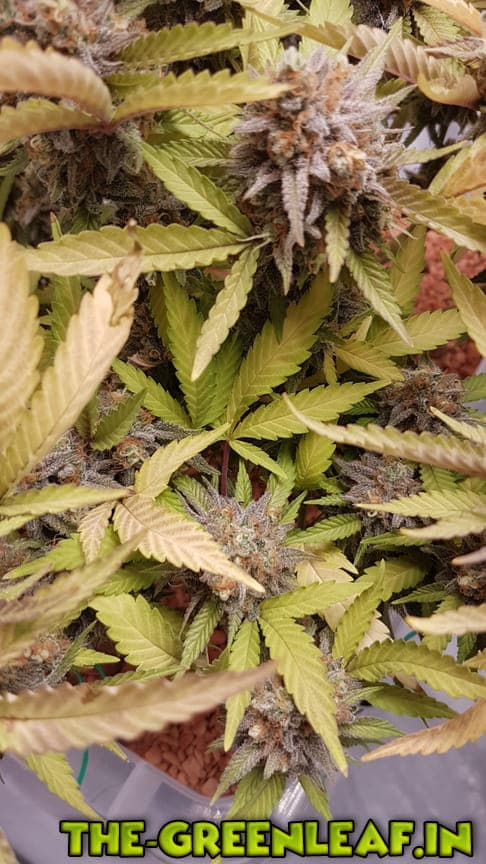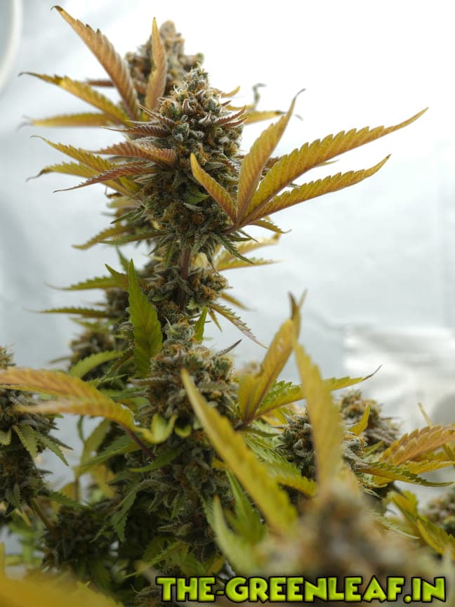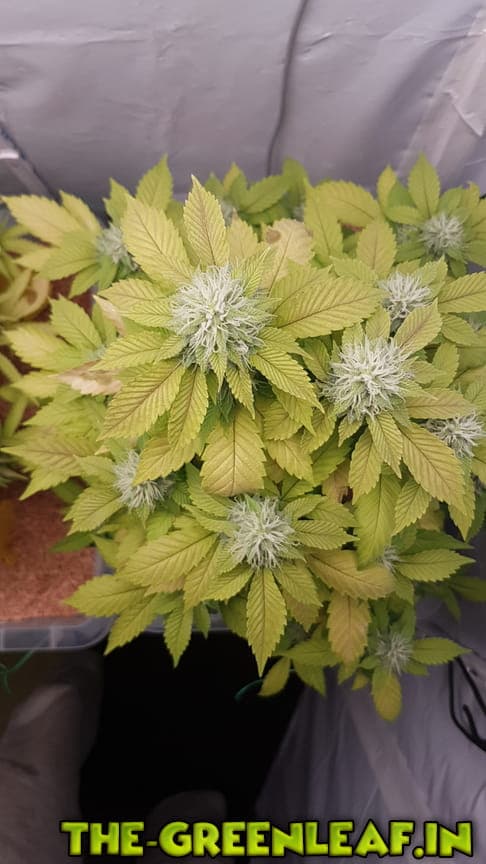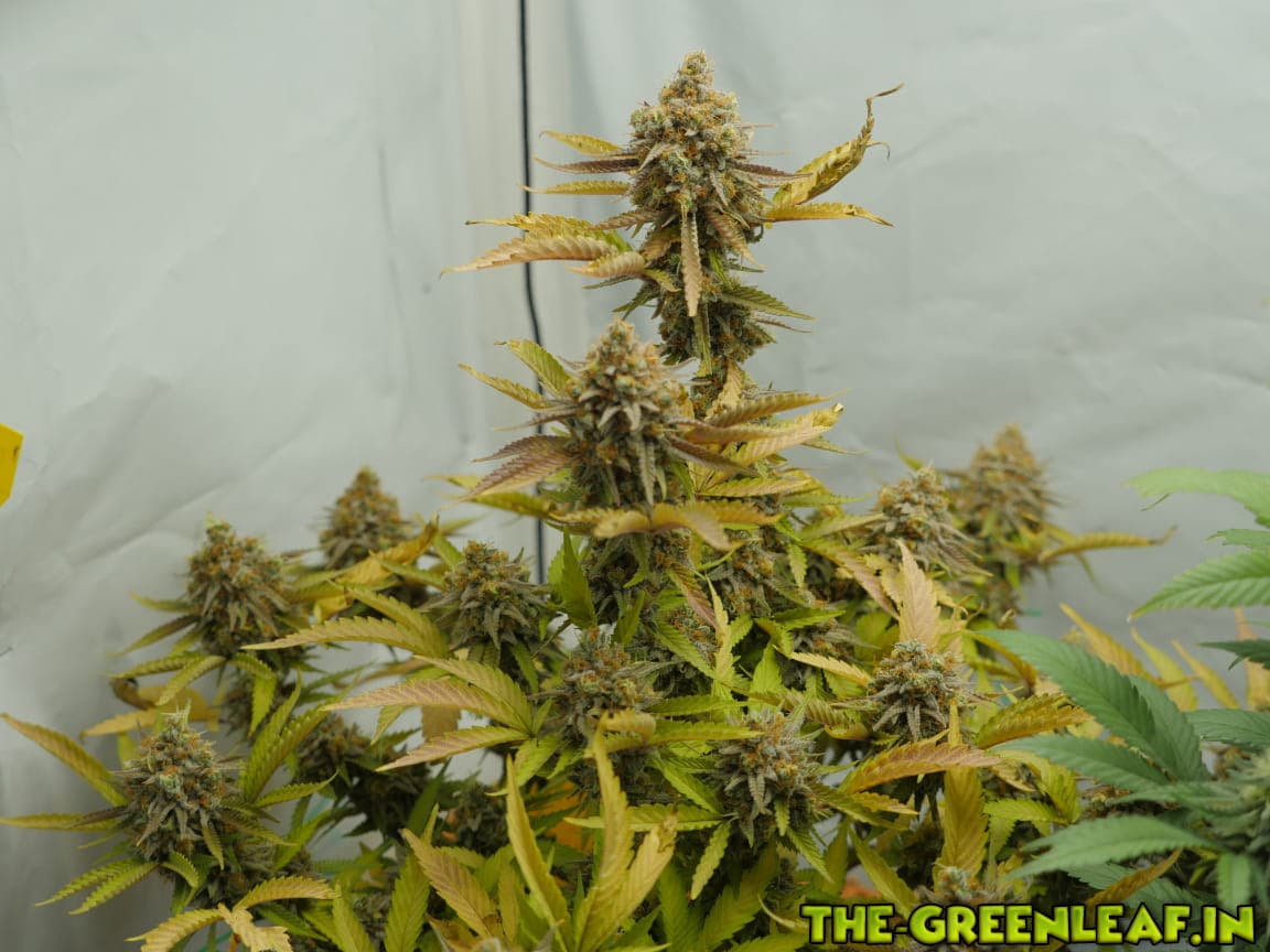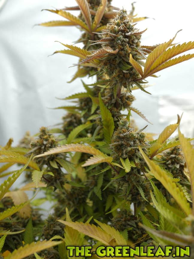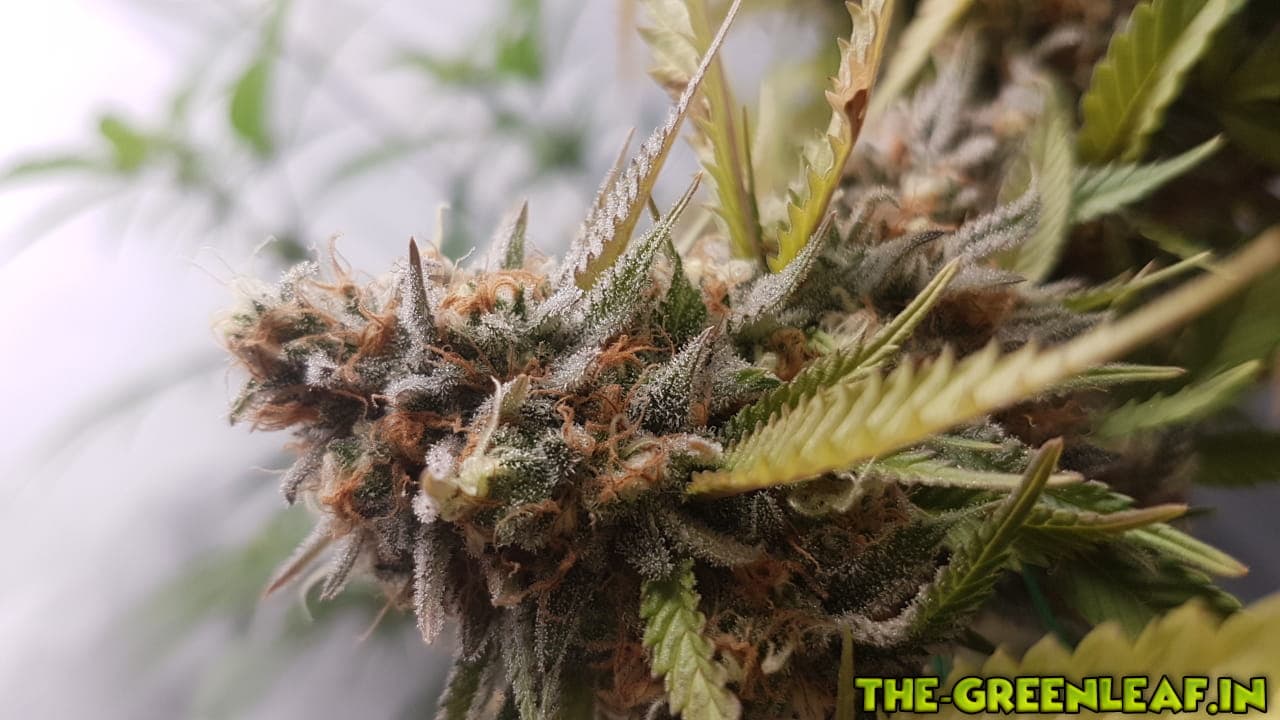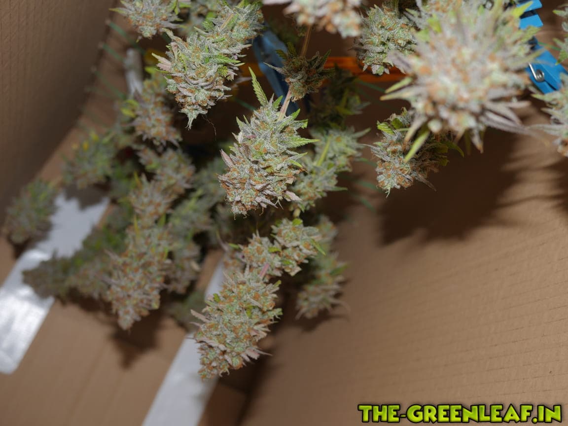 Die Sour Diesel geht in ihre letzte Woche. Spätestens am Freitag soll gernetet werden. Die unteren, größeren Blätter sind fast komplett mit Braunen/Milchigen Trichomen besetzt, je weiter es hoch geht, desto weniger braune werden es.