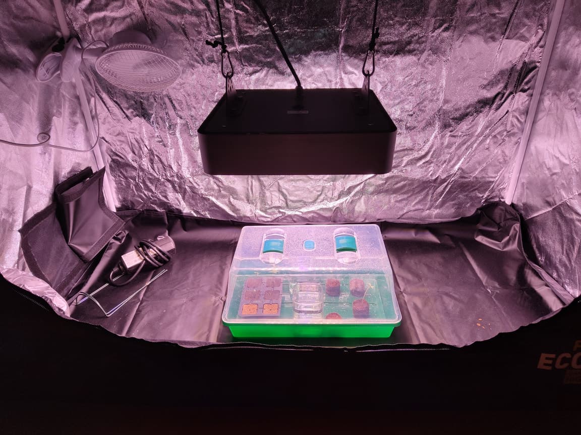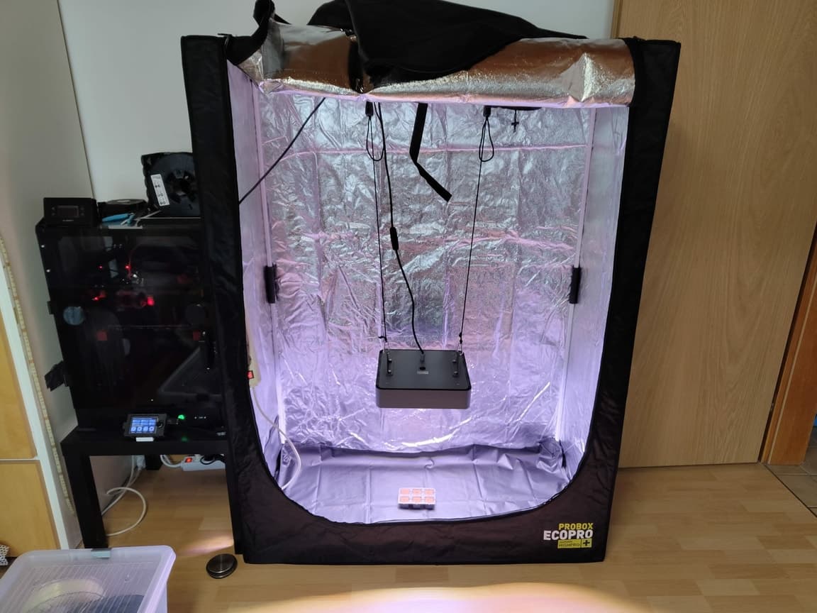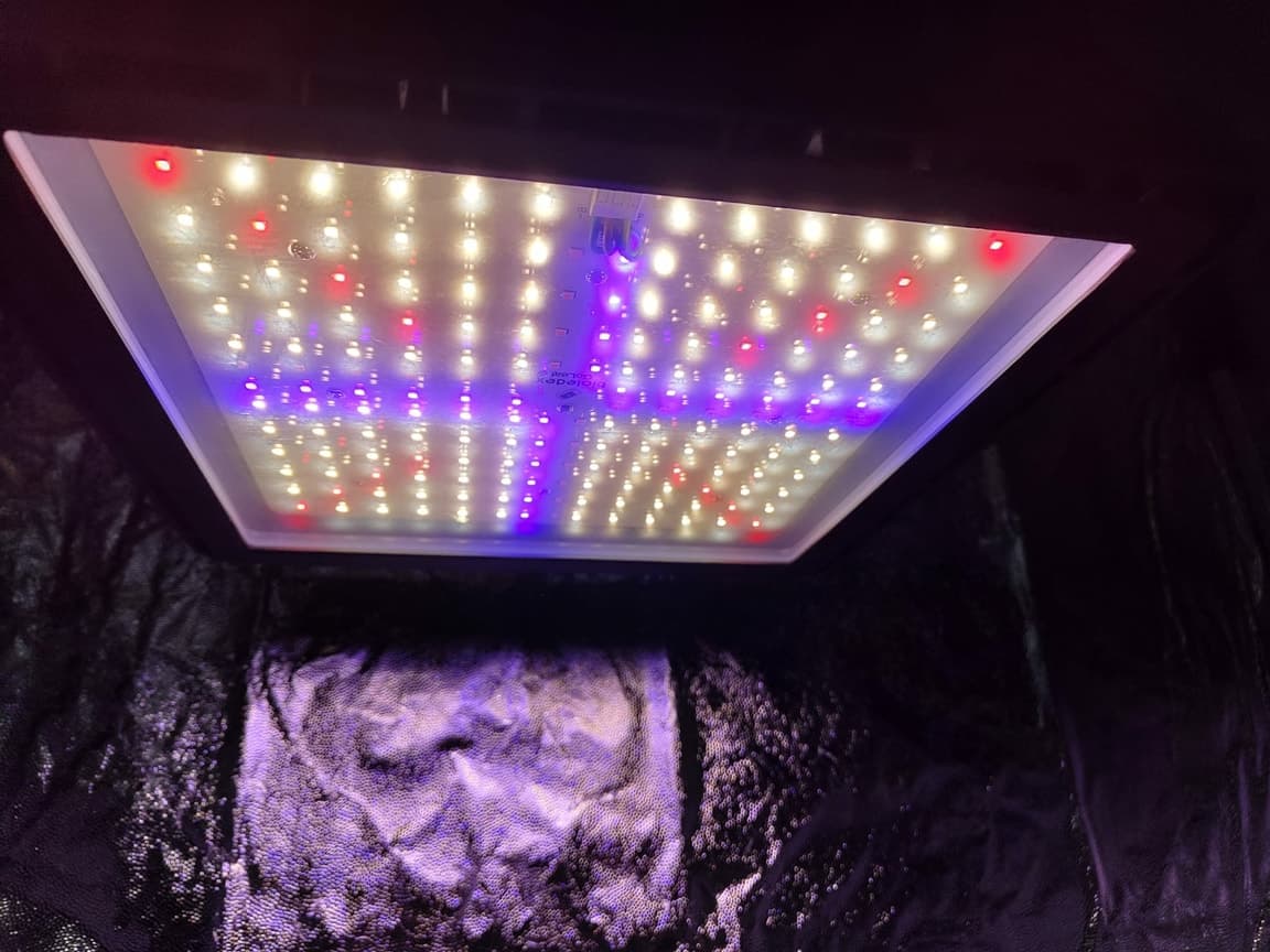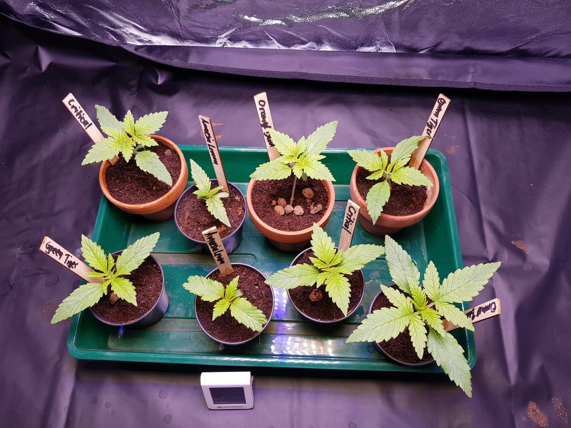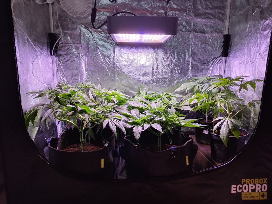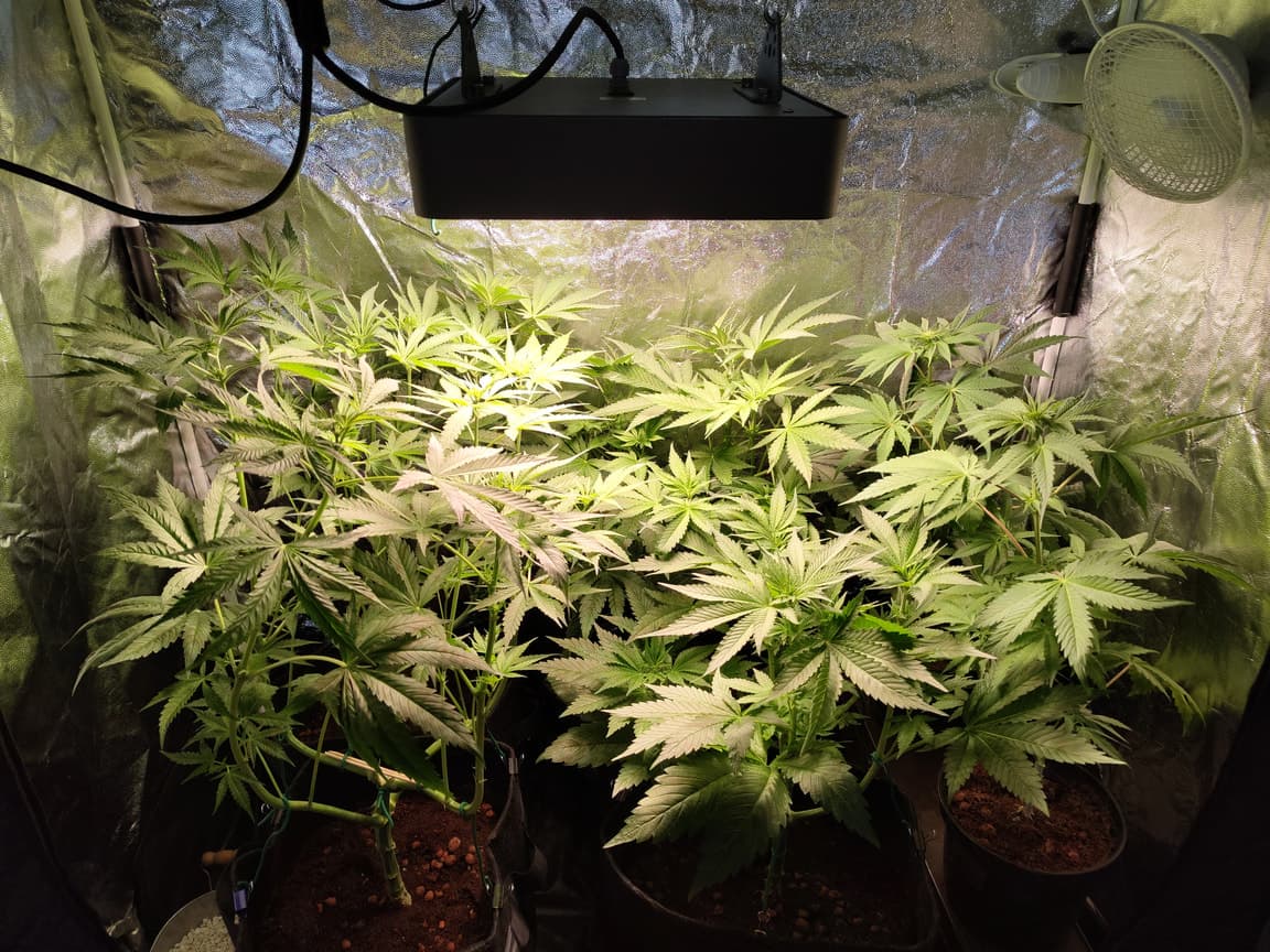 2 Wochen nach Umstellen auf 12/12 ist der Post-veg-strech in vollem Gange. Für die Green Tiger und Orange Bud im linken Teil etwas mehr als ich gehofft/erwartet hatte. Die Ausleuchtung der Lampe ist laut Hersteller 60*60 cm und das scheint auch recht gut zu stimmen, oder ich hatte die Lampe zu nah dran, so dass die Seiten nicht genug ausgeleuchtet waren. Die mittleren und rechten Pflanzen stehen jetzt auf Erhöhungen damit sie gleich hoch sind.