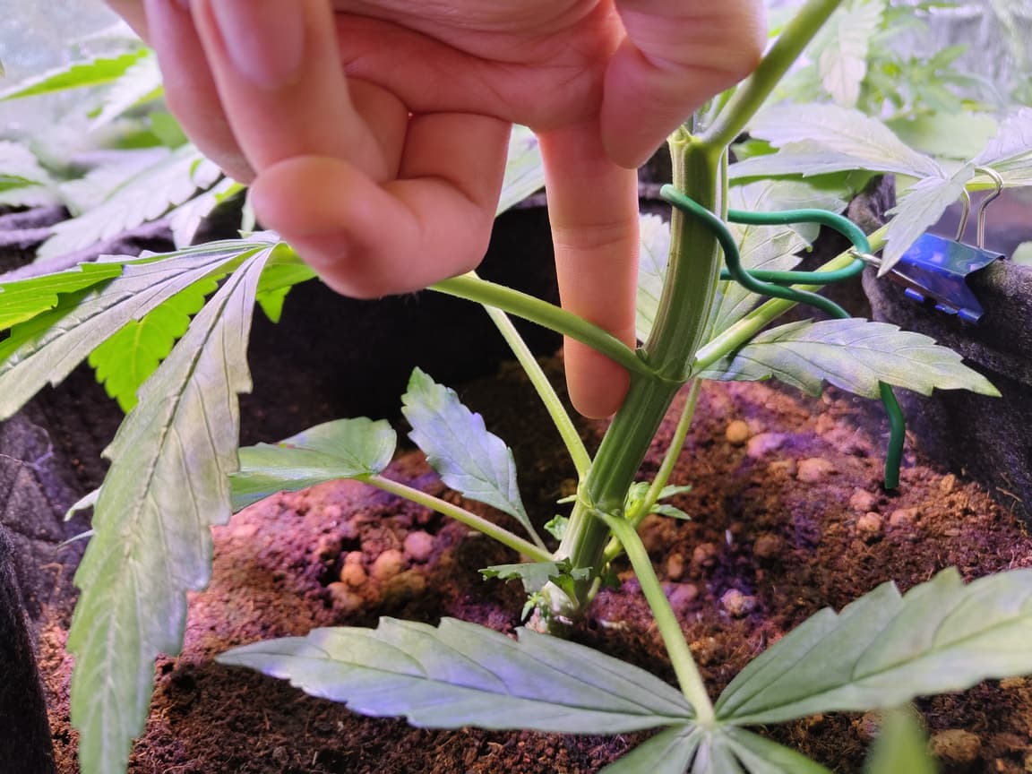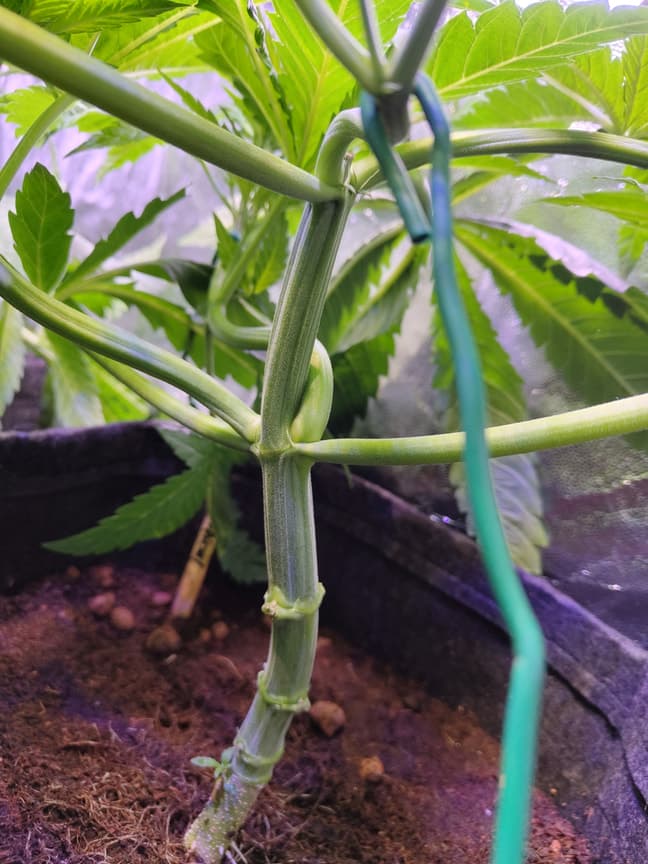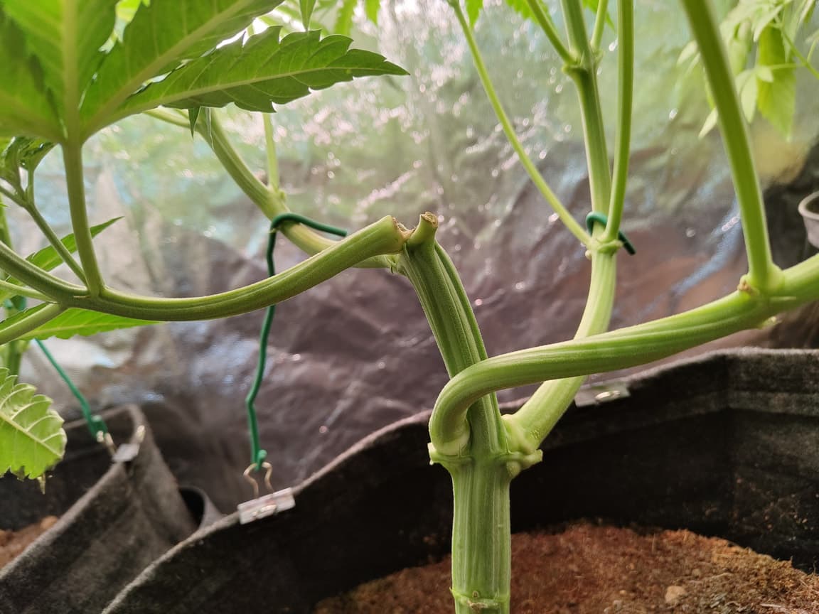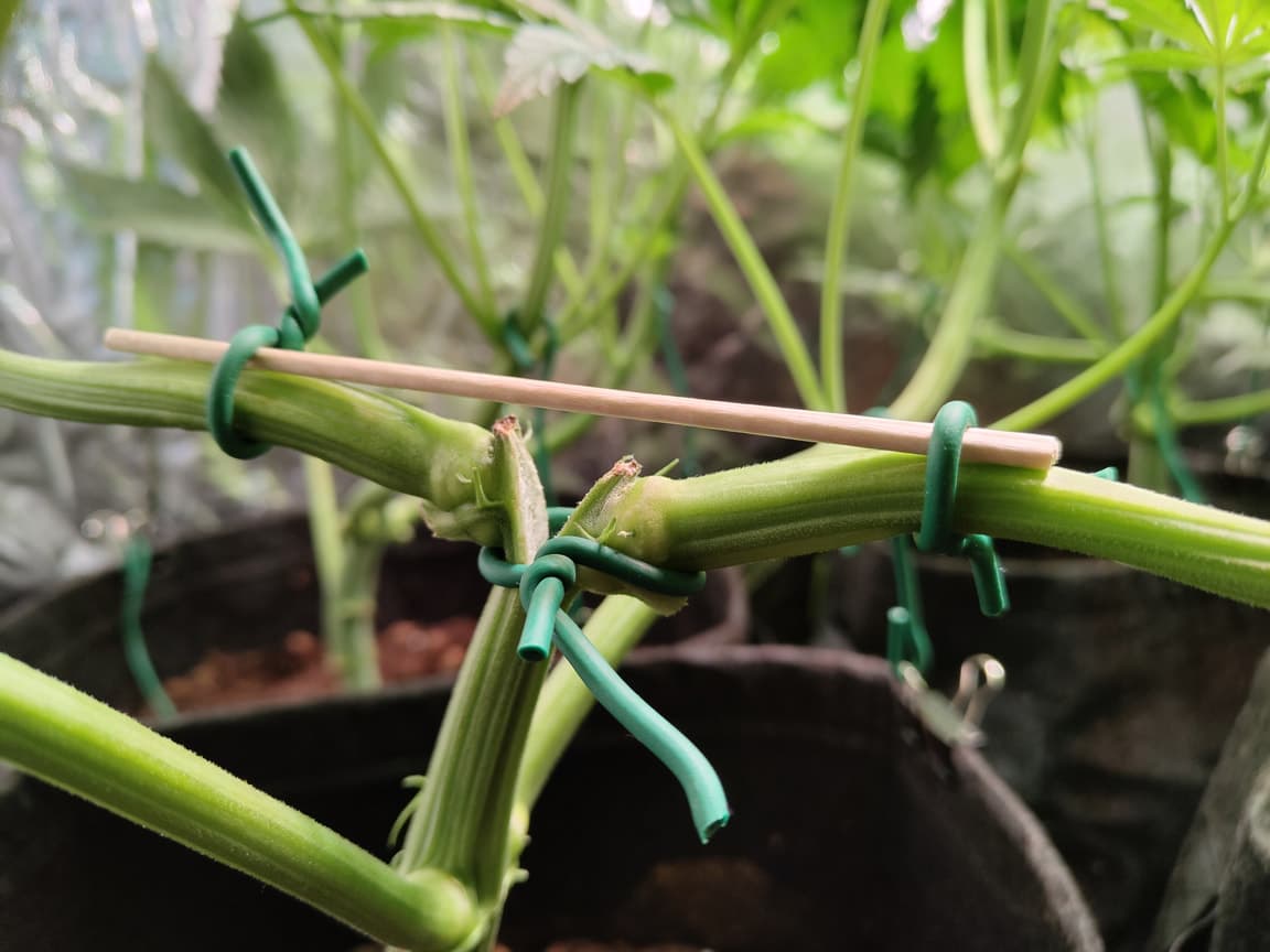 Der Stamm der Green Tiger hat sich gespalten und hat von mit ne Schiene bekommen. Hat jemand ne Idee warum ich dieses mal so Probleme mit Brüchigen Stilen habe? Meine Hypothese ist, dass die Stämme aufgrund der großen Töpfe zu dick für das LST geworden sind.