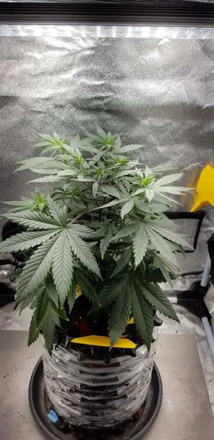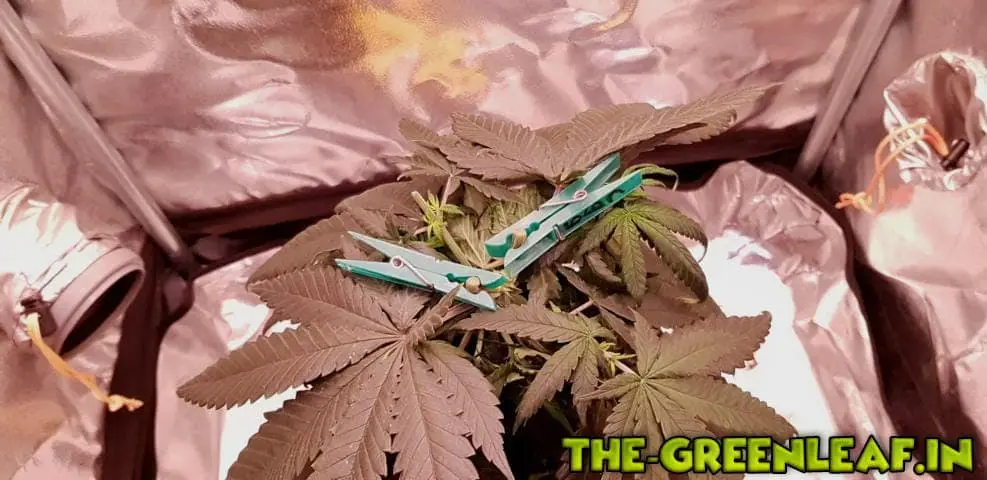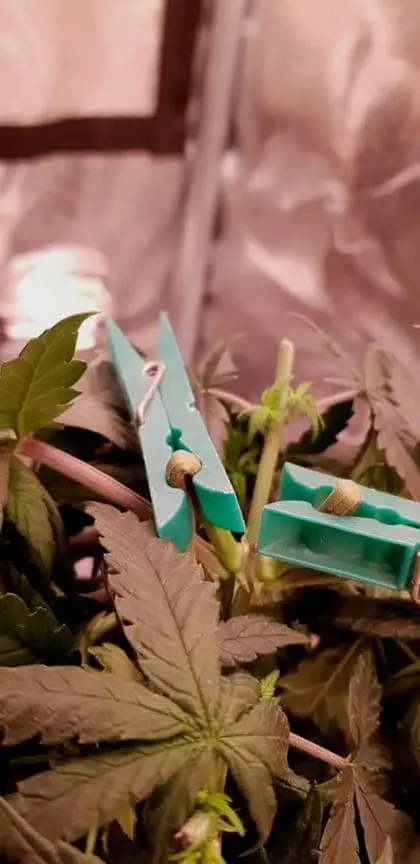 Ich treffe schon paar Vorkehrungen wegen meiner Abwesenheit. Die Y Triebe der getoppten Critical konnte ich nicht wie gewohnt biegen/knicken. Die sind so voll Saft das ich die um 90° gebogen, und mit Wäscheklammern fixiert habe ![]()