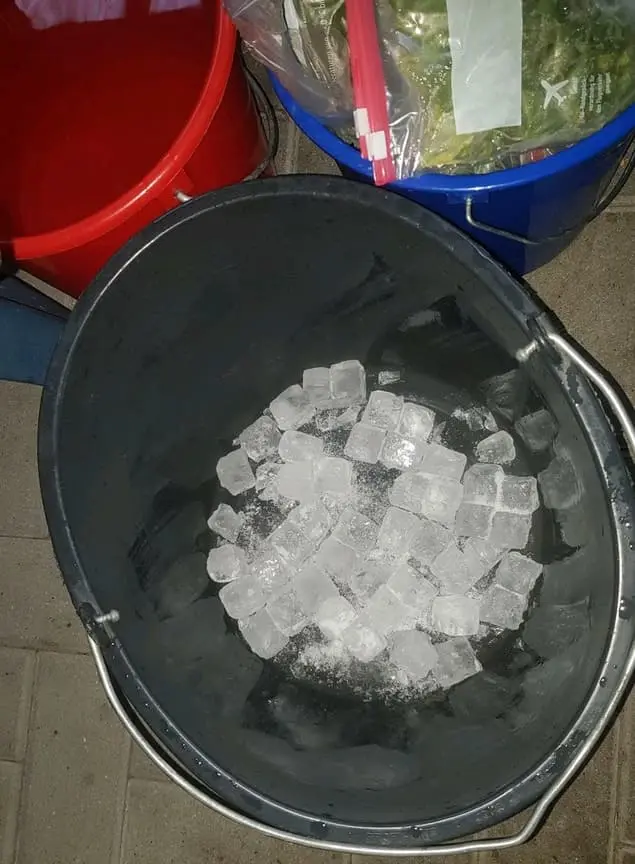 Dann immer 10 Liter Wasser, damit ich wenn das Eis und die Reste entfernt sind alles gut in den Eimer zum Absinken bringe,