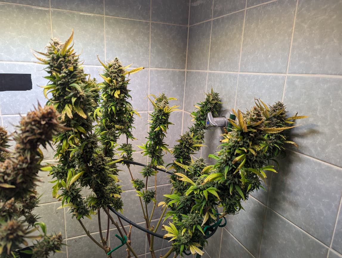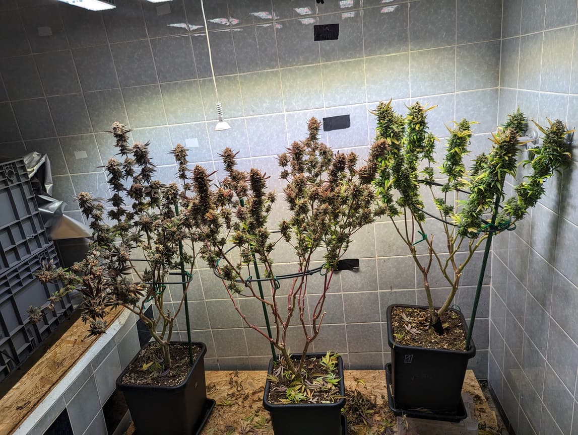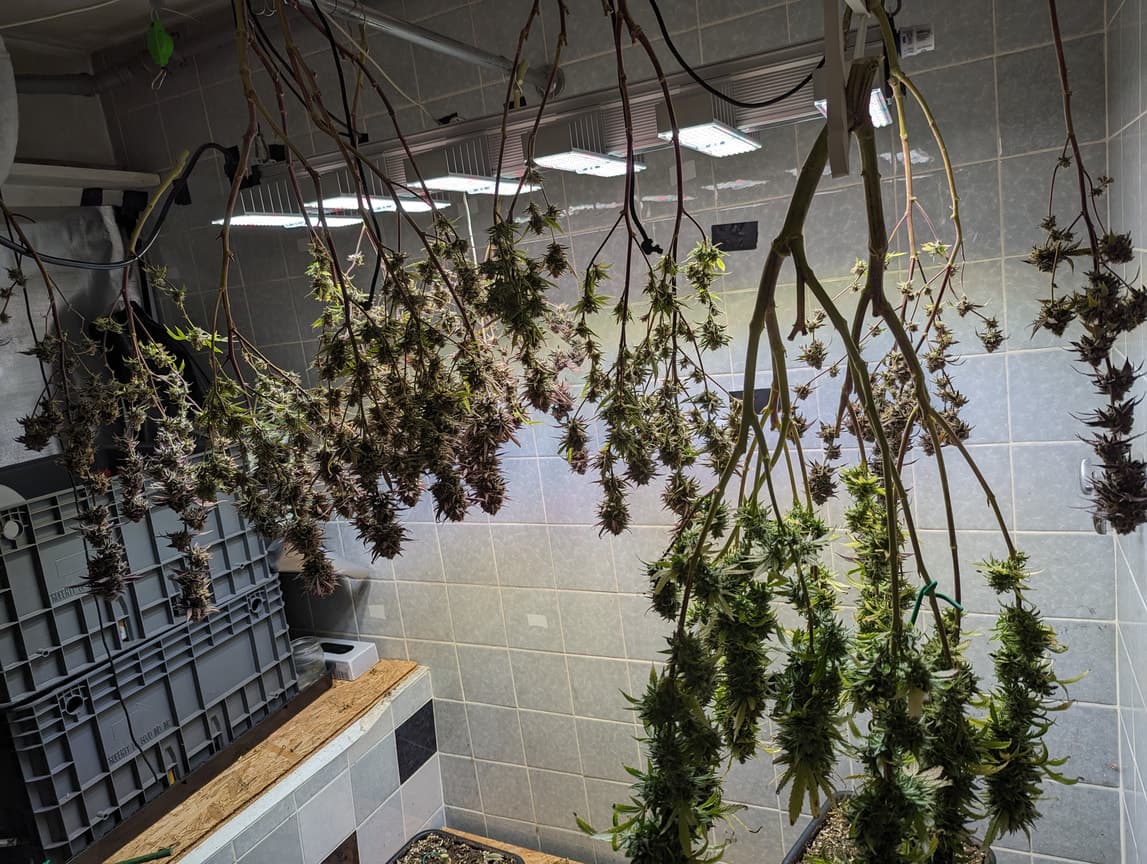 Die Pflanzen hängen nun seit 9 Tagen kopfüber zum trocknen. Leider bekomme ich momentan nicht das Klima hin, welches ich gerne hätte. Die RLF steigt immer wieder auf +70% und die Temperatur schwankt zwischen 21°c und 22°c.