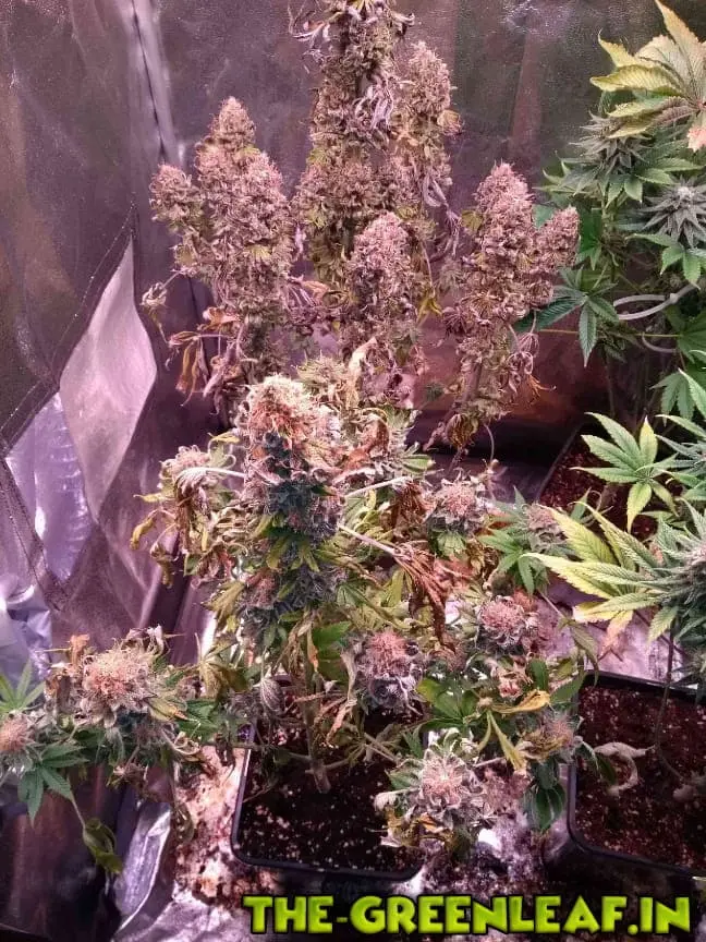 Critical und OB sind fertig und geköpft. Die beiden Flowerbomb Kushs sehen nicht besser oder schlimmer aus als vorher, kriegen noch ein paar Tage. Die beiden CBD-Pflanzis.... Blumat hat versagt, die haben 10 Tage nun kein Wasser bekommen, keine Ahnung warum. Ich traue Blumat nicht so ganz, das letzte Mal hat das prima funktioniert, diesmal gar nicht, obwohl beide 2 Blumaten jeweils zur Sicherheit drin waren. Siehe Bilder. Noch was zu retten? Köpfe sind nicht milchig, die bräuchten noch. Hab eben gelesen, CBD-Pflanzen kann man früher ernten, aber richtig einig ist man sich da wohl nicht. Wenn ich die nun notschlachten muss, kann ich die in den Müll kippen oder hat das schon nen gewissen CBD-Gehalt? 9-12 Blütewochen laut Hersteller, bin in Woche 9. Vordere Pflanze hat noch vereinzelt grüne Blätter, hintere so gut wie alles braun.