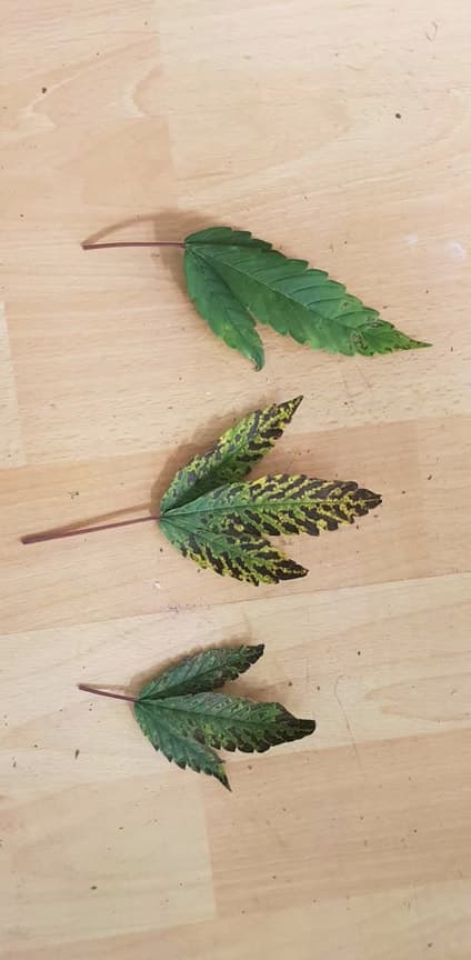 Sind alles Amnesia Haze Klone, ich kenne diese genetik, die ist recht recht zickig, dieses Schadbild hatte ich aber noch nie. Die Blätter sind eher so vom mittleren/oberen Teil der Pflanze. ist BW 2 nicht sehr früh für Phosphormangel? Danke soweit