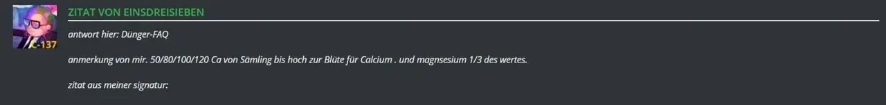 Laut 137 sollen wir uns über Kalziumwert orientieren, danach Magnesium (ein Drittel von Kalzium). Soweit so gut. Jedoch, wenn wir die Dünger hinzugeben, die ja auch Mg beinhalten, komme ich durcheinander mit den EC-Werten. Entweder liegen sie über, oder unter dem gewünschten Zielwert. Wie berechne ich die optimale Menge? Denke mal über Funktion mit 2 Unbekannten, aber wie mache ich das hier? Wenn ich Mg passend geben sollte, dann habe ich zu niedrigen EC-Wert. Wenn ich nach dem EC-Wert die Dünger hinzugebe, dann stimmt die Cal/Mg-Ration nicht mehr.