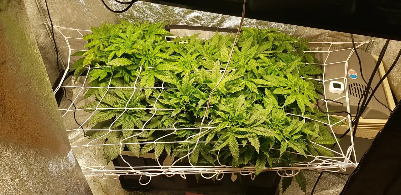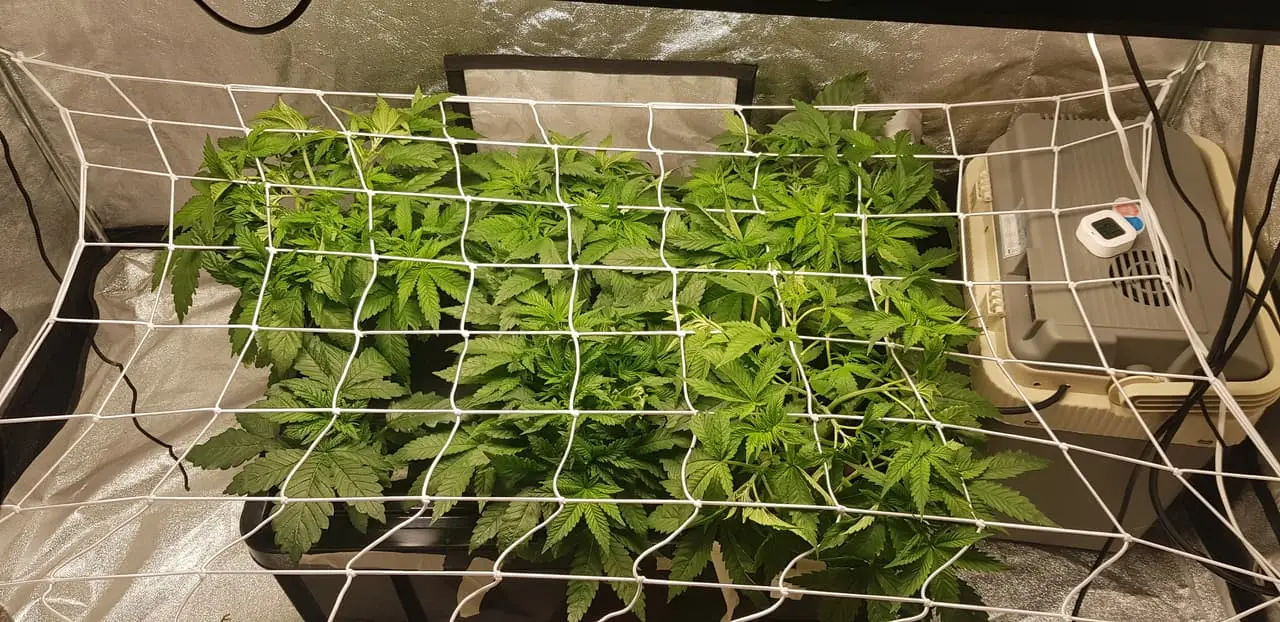 Kleines Update. Mein Trellis/Scrognetz von Secret Jardin ist da. Da mein Zelt 150x80cm, das Netz aber 150x150 ist habe ich leicht improvisiert. Meine Grösse war nicht auffindbar in sehr vielen Growshops. Na jedenfalls ist sie jetzt angebracht.