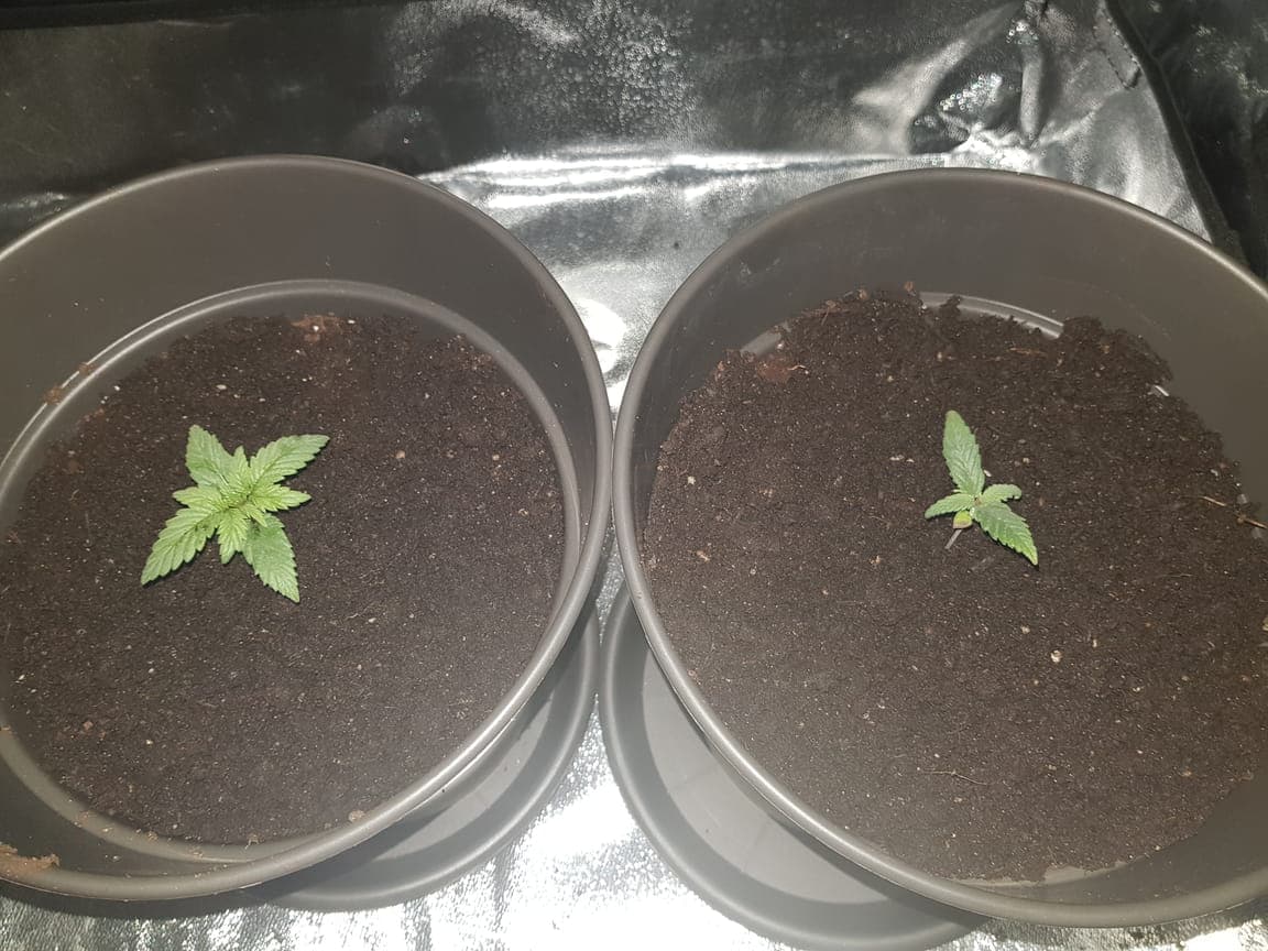 Hallo Jungs, so sehen momentan beide Pflanzen aus. Das sind 12 Liter Stofftöpfe und ich habe bereits auf 12/12 umgestellt.