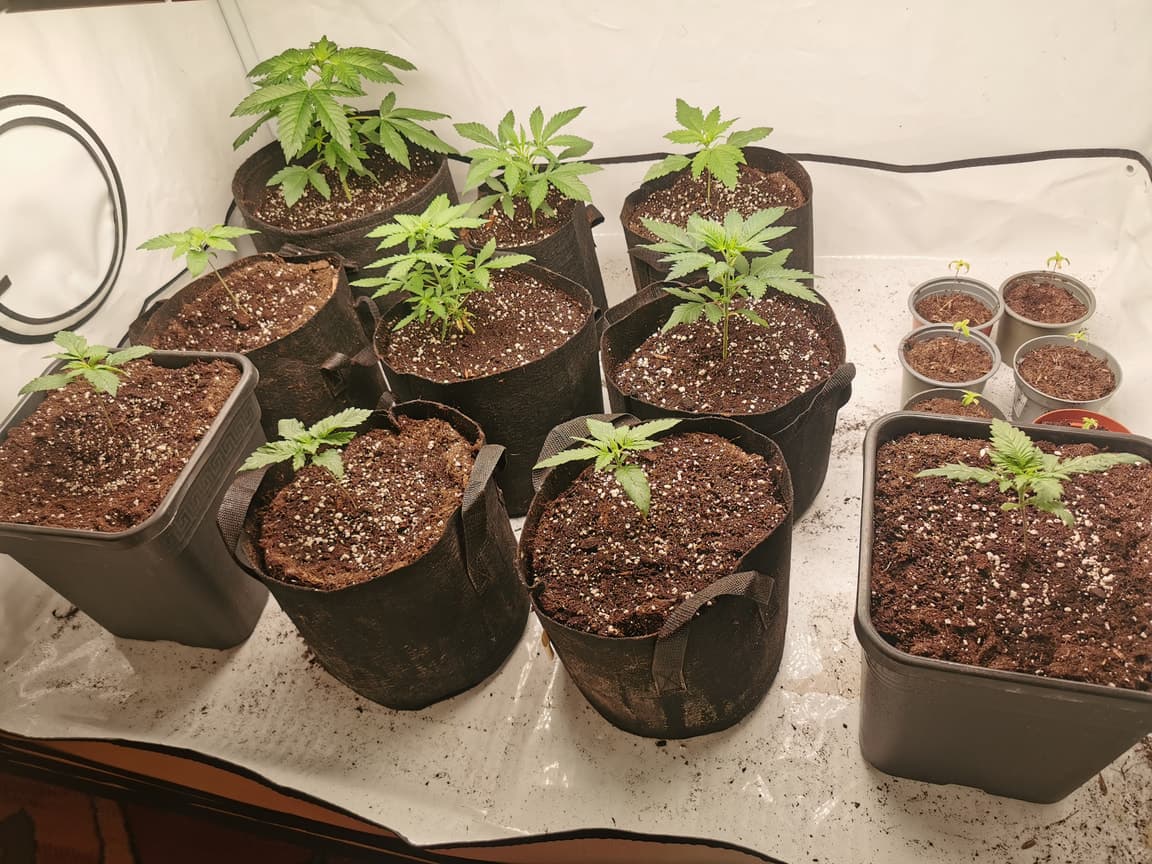 Bekomme 1 Zelt jetzt voll mit 4 verschiedenen Strains, weil 8 von den ursprünglichen neuen 10 x Grapefruit schon wieder so aussehen (siehe Bild). Zwei Stück habe ich umgetopft und sehen super aus. Ganz normal gewachsen. Dennoch sind die Plants alle etwas unterschiedlich groß, was ich mit Training wieder wett mache.