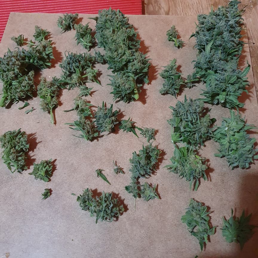 Bin nun fertig mit ernten. Natürlich hat mein Trockenschrank nicht gereicht und musste noch einiges woanders lagern. Habe mir auch fette Gläser zum curen besorgt und diese Feuchtigkeits packs. Oben stehen nun noch 4 Purple Bud, glaube die brauchen noch 1-2 Wochen. Baue mir jetzt gerade ne Wurmkiste und schmeiß dort die ganzen Abfälle (Erde, Pflanzenreste ) rein. Ob die Würmer high davon werden?