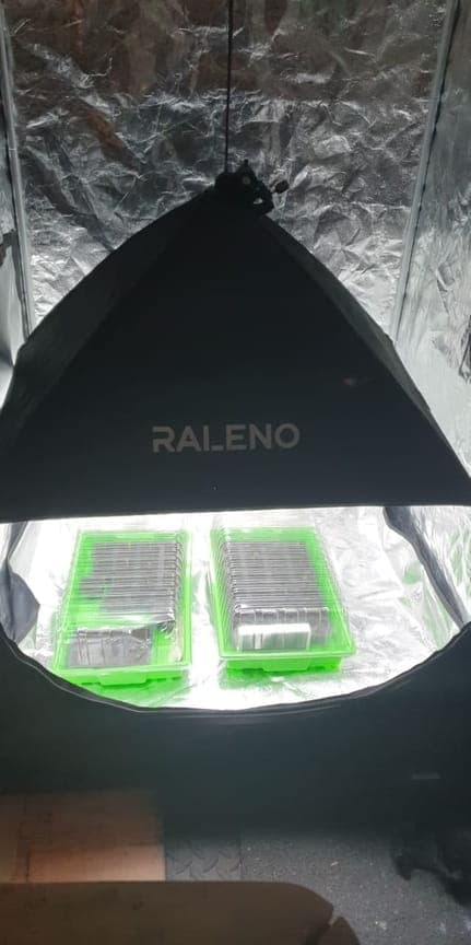 Achja, habe eben das Growzelt aufgebaut und meine kleinen reingestellt plus Lampe