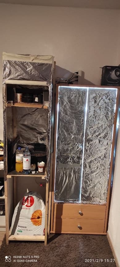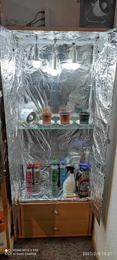 Die Pflanzen wuchsen 2 von 3 Wochen in dem Vorkeim-Kasten bei gleichem Setup! Vor 3 Tagen habe ich den jetzigen Schrank eingerichtet und die Pflanzen während der Tagesphase umgestellt.