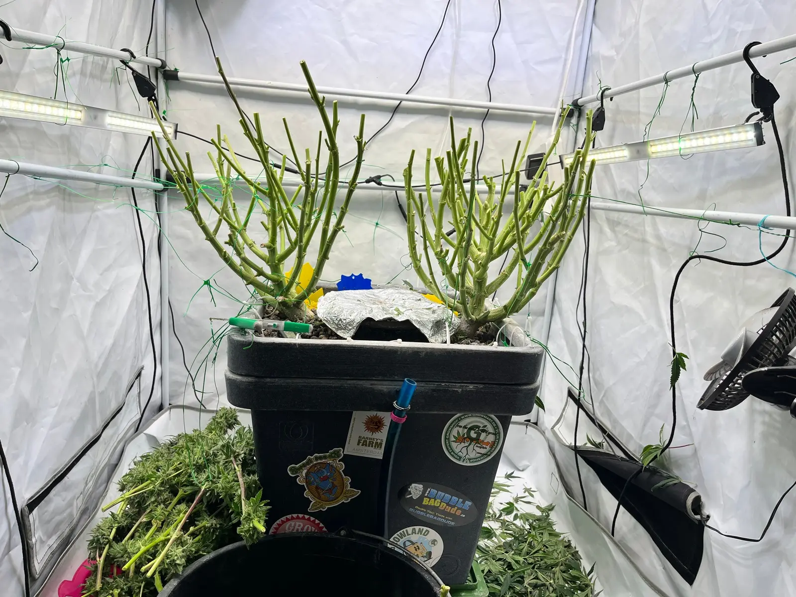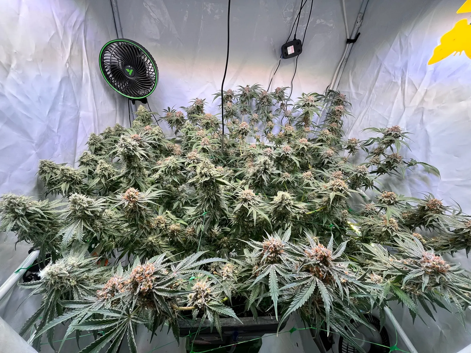 Der Plan ist alles noch etwas breiter machen dann alle Triebe kappen 4-7 Tage warten und ab 12/12 (wenn noch ca. 20% vom Boden zu sehen ist wenn man von oben drauf schaut)