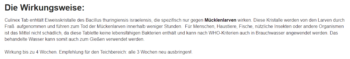 "Für Menschen, Haustiere, Fische, nützliche Insekten oder andere Organismen ist das Mittel nicht schädlich, da diese Tablette keine lebensfähigen Bakterien enthält und kann nach WHO-Kriterien auch in Brauchwasser angewendet werden"