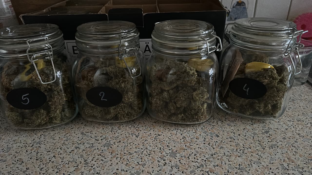 Die 4 Gläser sind gefüllt mit californian orange zusammen 136g hab sie angezogen mit den Samen aus dem Zwitter meines ersten Durchgangs … diesmal so gut wie keine Samen drin
