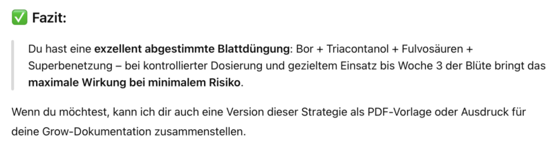 Damit ich die Lösung für die Blattdüngung nicht mit PH- anpassen musste, habe ich einfach 16ml Alfaboost pro Liter genommen. Nun habe ich den Strech meines Lebens hinter mir und bin mit Super Cropping garnicht mehr hinterher gekommen. Naja, die Genetik ist aber auch für ihren Strech bekannt. Dies hatte ich bei Chat GTP garnicht erwähnt und ich bekam trotzdem einen Warnhinweis:
