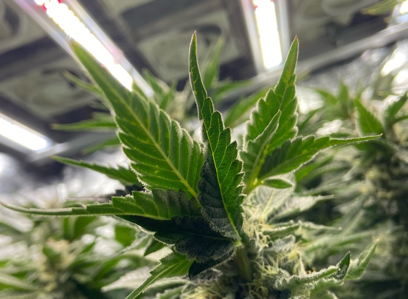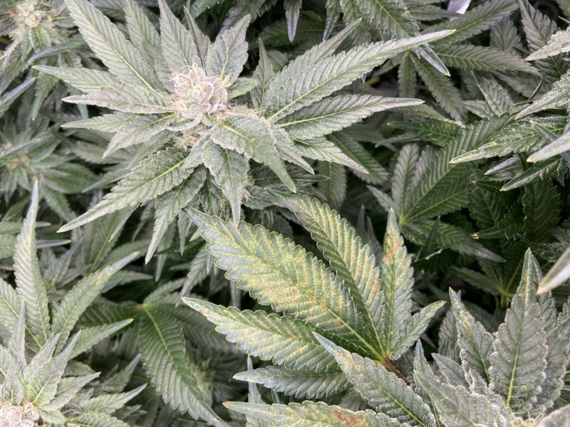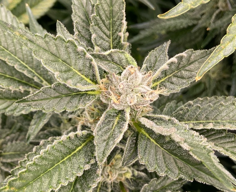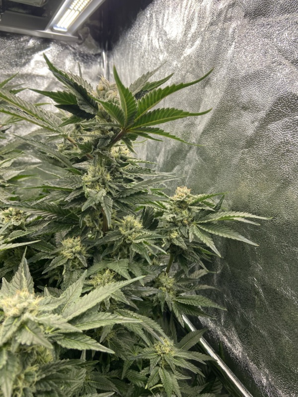 Einige Blätter ganz oben an den Buds kringeln sich so komisch. Vorsichtshalber habe ich das Licht von 800-1000 PPFD auf 600-700 PPFD runtergeregelt. Ich hatte auch mal gelesen, dass man zum Ende der Blüte die Lichtstärke wieder etwas reduzieren kann: -