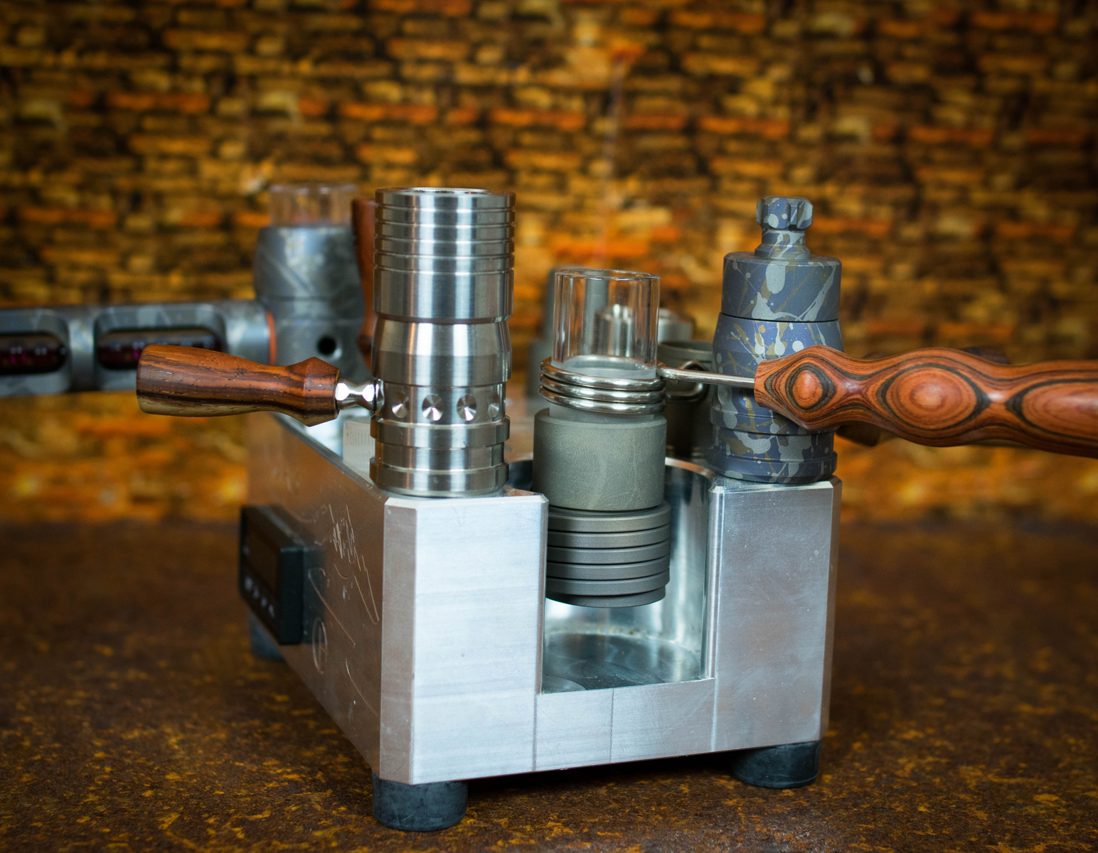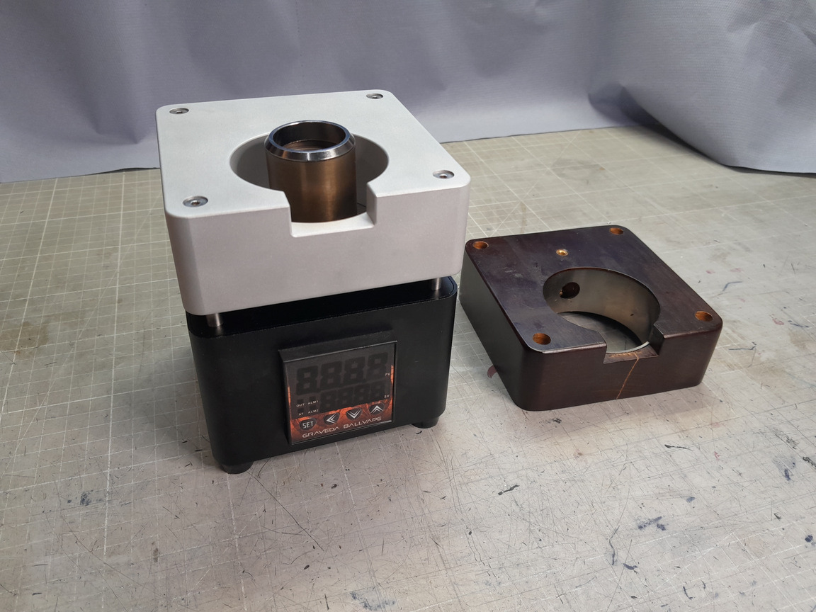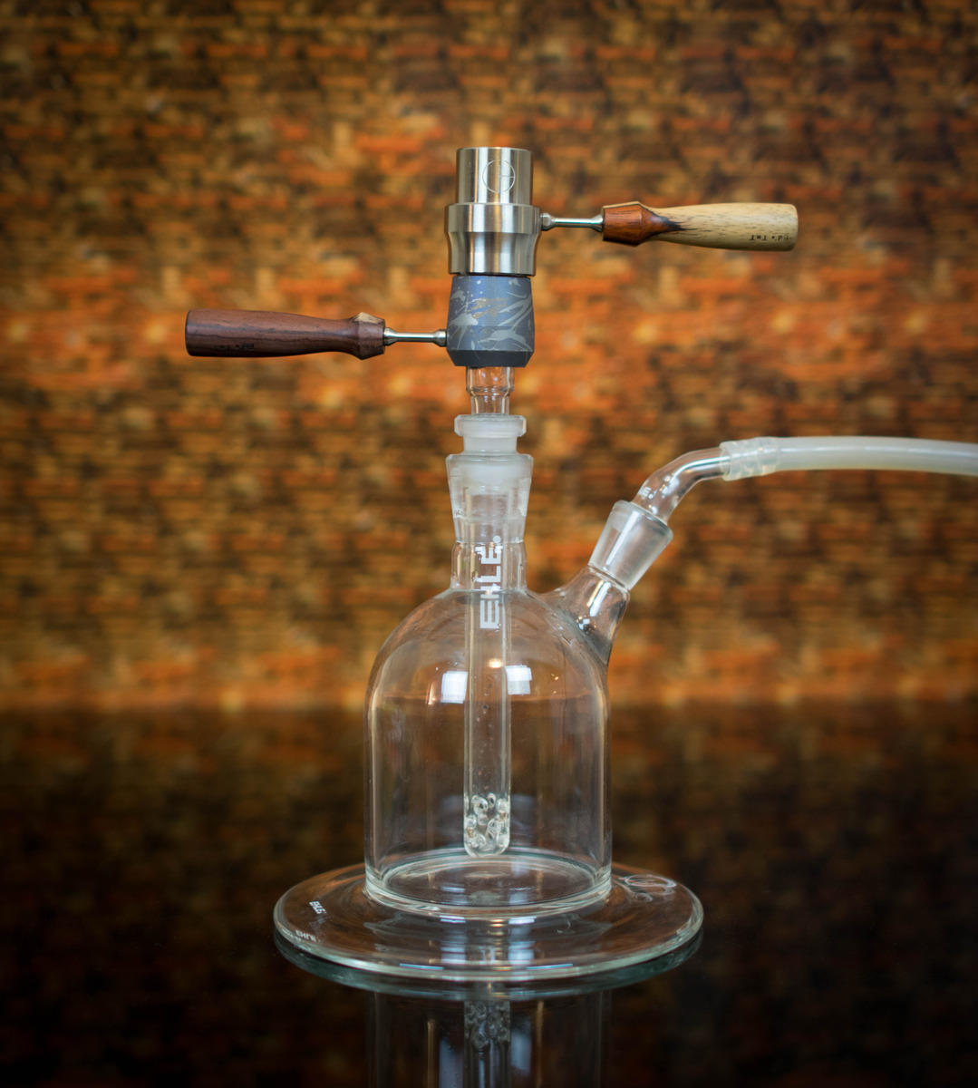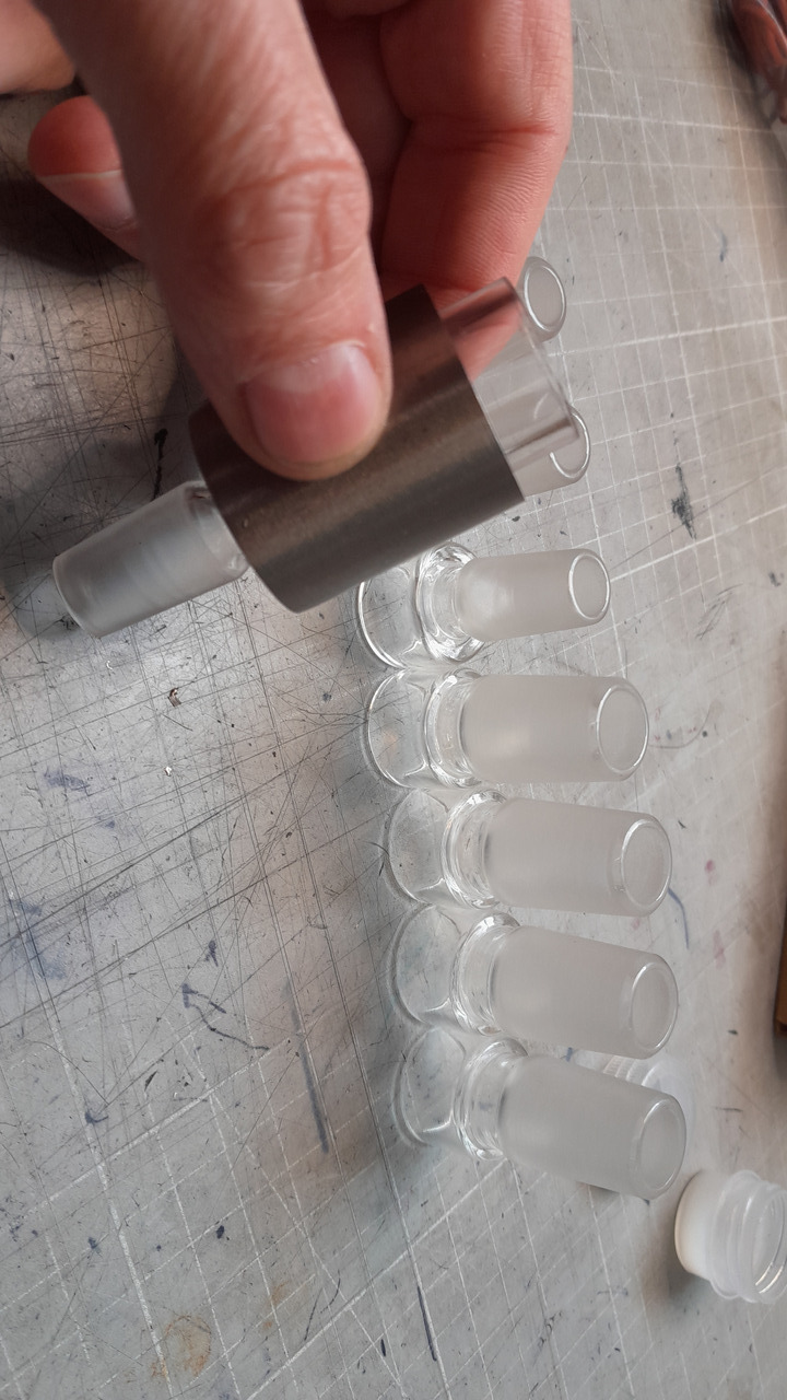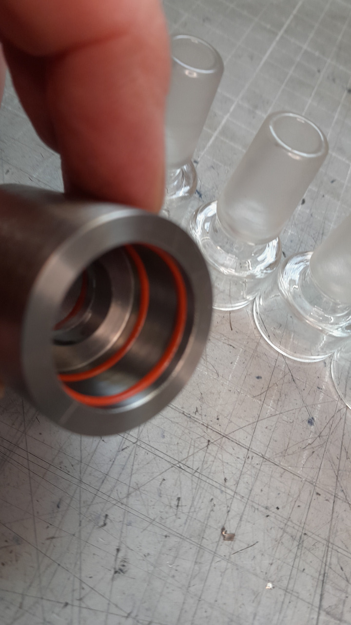 Eine Sache, die mich in letzter Zeit beschäftigt hat, ist, dass ich einen Bowlständer gesucht habe, der einen 14er und 18er Schliff ohne Probleme aufnehmen kann. Leider habe ich nichts Passendes für mich gefunden, und so habe ich mir einen aus Titan gebaut. Unten ist eine 80mm-Titanplatte, die auch mal etwas auffangen kann, wenn etwas danebenfällt. So bleibt der Tisch sauber. (wie immer, ich nehme keine Auftragsarbeiten an)
