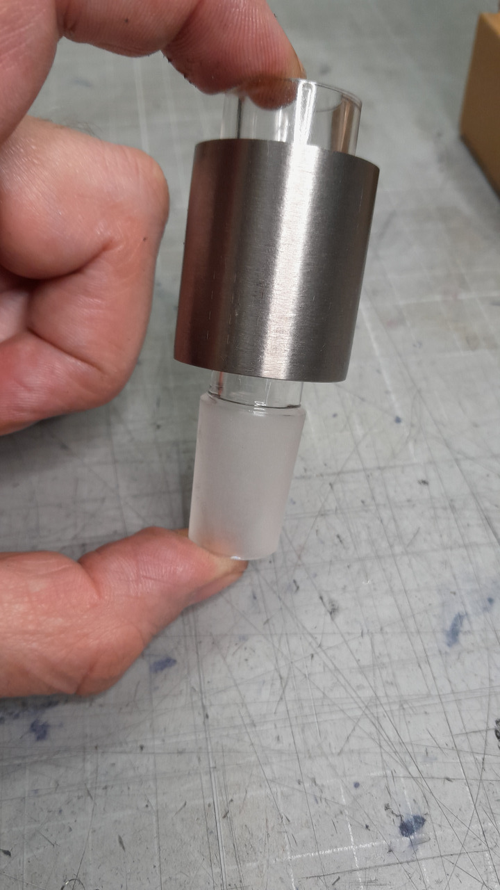 Meistens 500mm, oder auch 1m Stangen.Der QR-Baller ist einer meiner Lieblingsköpfe. Damit ich ihn auch in der Moab verwenden kann, habe ich mir einen Adapter für die Heizspule gebaut (natürlich aus Titan). Einen Adapter für die Bowl hatte ich schon gezeigt, aber heute gab es einen zweiten. Der Adapter wird sicher durch 2 O-Ringe gehalten und natürlich ist er aus Titan. Das Finish ist bis jetzt nicht fertig, wie bei der Bowl, aber der Funktion tut es keinen Abbruch.