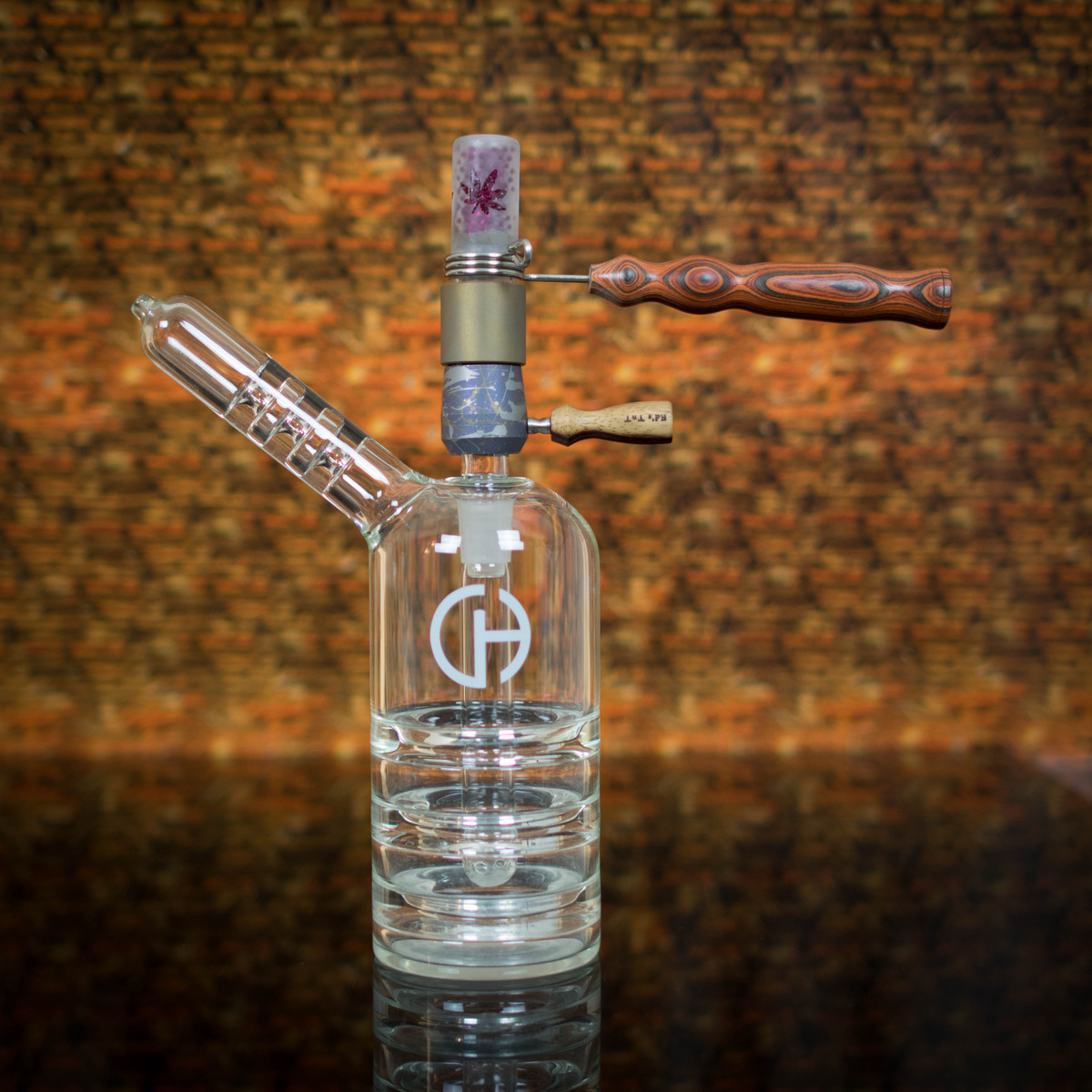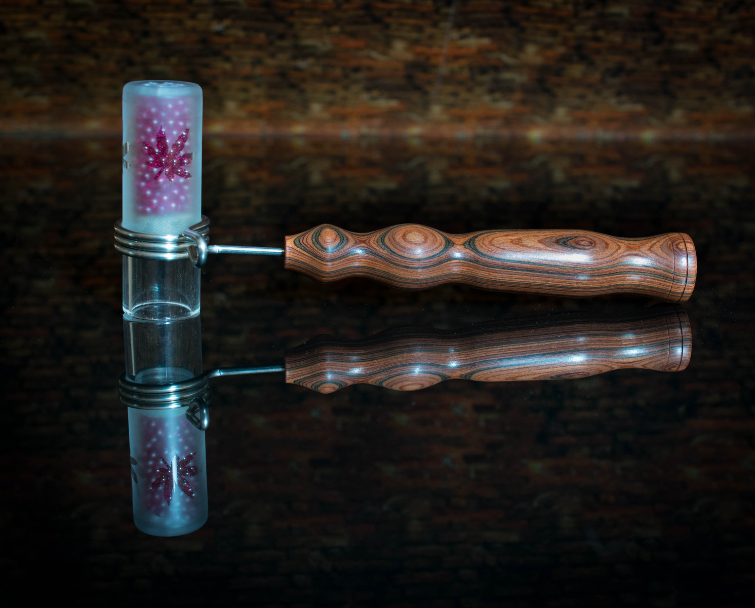 Ja, das Glas habe ich mit Cannabisblättern verschönert und ein Freund, hat mir auch einen vernünftigen Griff gebaut.