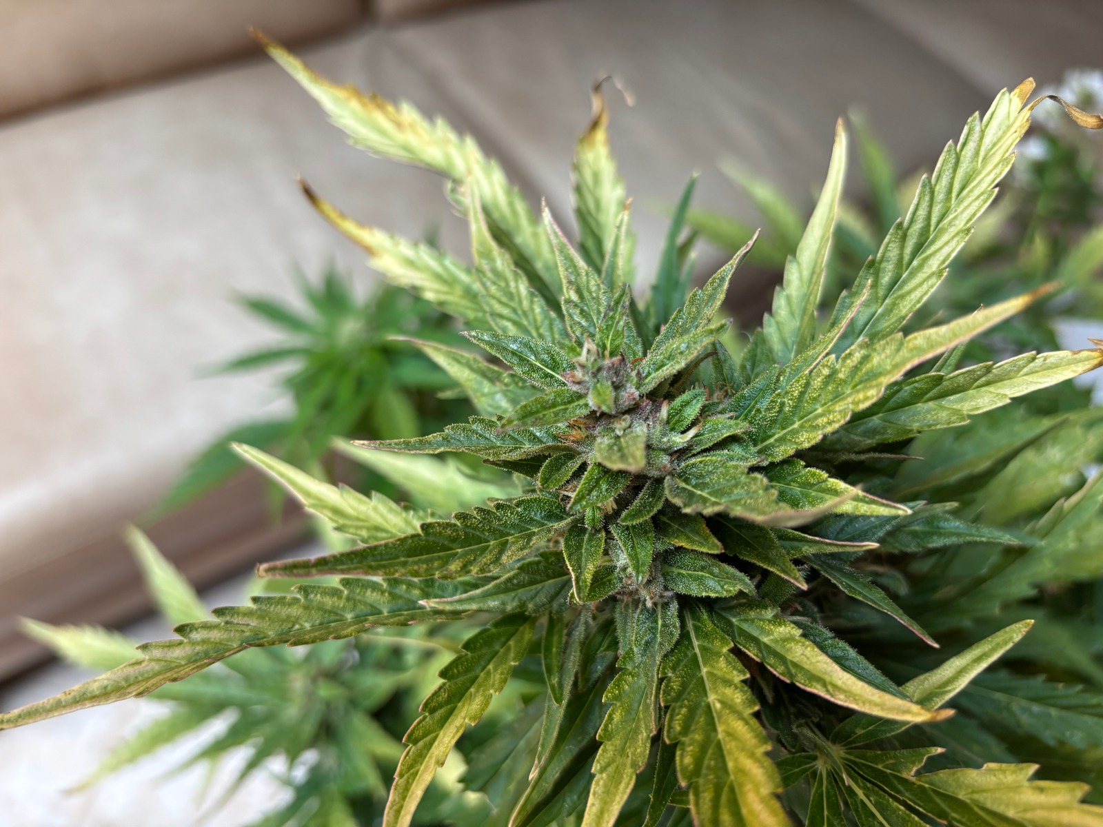 Habe mir gedacht ich hole sie mal rein, gleich ein paar Gelbe, zerfressene Blätter abgemacht, aber wie man sieht nicht zuviel. Gießmenge ca. 4 Liter pro Tag. Bei der letzten Gabe waren 40% Blüh Complex u. 100% Phosphor Plus dabei. Man kann in einzelnen Blütenansätzen etwas Purple erkennen.