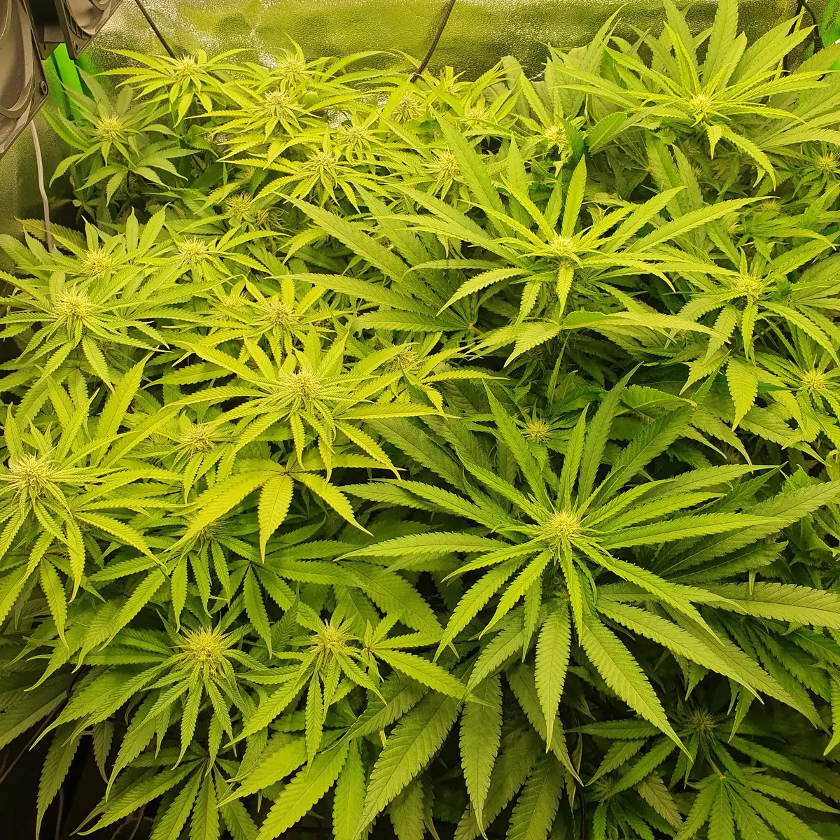 Jetzt ist bei den Ladies ein sehr dichtes Blätterdach mit vielen Knospen, die recht eng beieinander stehen. Es sind 2x3 PC P14 Lüfter versetzt recht und linke Seite sowie 1 x Schwenkventi von oben schräg nach unten und 1x von unten schräg durch die Pflanzen nach oben verbaut.