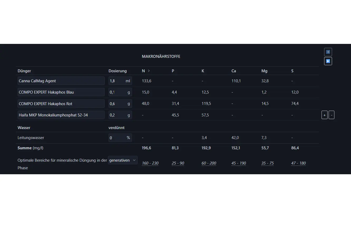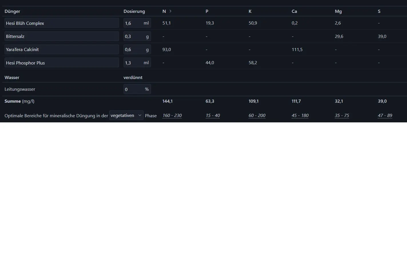 Wenn du mal ausrechnest, was pro Liter tatsächlich an N, P, K etc. landet, siehst du oft, dass das kaum die Hälfte von dem ist, was Pflanzen in Erde normalerweise brauchen. Kein Wunder, wenn dann Mangelerscheinungen auftreten.Ich habe nur deine bekannten Werte eingegeben und mit Mühe kam das obenstehende Ergebnis raus. Wenn du das mit deiner Stammlösung vergleichst, wirst du das merken. Dein Dünger ist wahrscheinlich auch nicht der richtige für deine Wasserqualität.